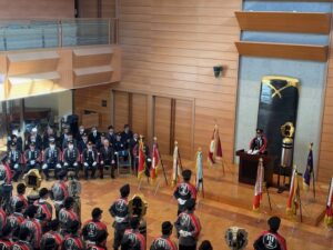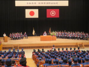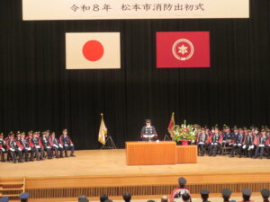 令和8年の新春、県下各地で消防(団)出初式が行われています。1月4日(日)は県下最初の出初式が松本市(宮坂明直消防団長・県消防協会理事)で開催され、団員、消防関係者約600人が参加しました。今回初めて式典をキッセイ文化ホールで、また合わせて初陣祭と称して、隣接のエアウォ―ターアリーナで特設ステージの催し、防災体験や縁日ブースなどを開催。大勢の市民の皆さんで賑わいました。式典では消防団員の表彰や来賓祝辞が行われ、新田副知事、県協会福澤会長ほか御来賓が祝辞を述べられました。