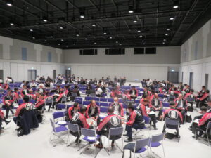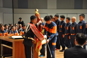 令和7年4月8日、長野県消防学校で初任科第68期の入校式が行われ、9月27日までの研修がスタートしました。入校したのは、本年度県内13消防本部に採用となった新任消防吏員80名(男性73名、女性7名)。敷地内の学生寮で共同生活で送りながら実日数113日、788時間に及ぶ講義や実習を受けます。来賓祝辞の中で長野県消防協会福澤会長は「志を同じくする仲間と助け合い、立派な消防人となられるよう祈念します」と激励しました。