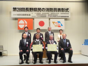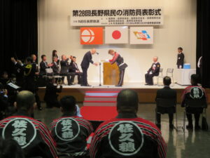 第28回「長野県民の消防員」表彰式が2月28日(土)、主催の長野放送本社NBSホール(長野市)で行われ、団体の部で佐久穂町消防団(篠原充彰団長)が受賞しました。この表彰は、県民の生命と財産を守るために献身的な努力を重ねておられる模範的な消防員の労苦に報い、併せて消防活動について県民の理解を一層深めていこうというもの。選考委員長として県危機管理部長、選考委員を全共連長野県本部、こくみん共済COOP長野推進本部、長野県消防長会、長野放送及び当協会の各本部長、会長等が務めておられ、昨年12月に選考委員会が開催されました。なお、個人の部は、岳北消防本部消防司令小林博希様が受賞されました。